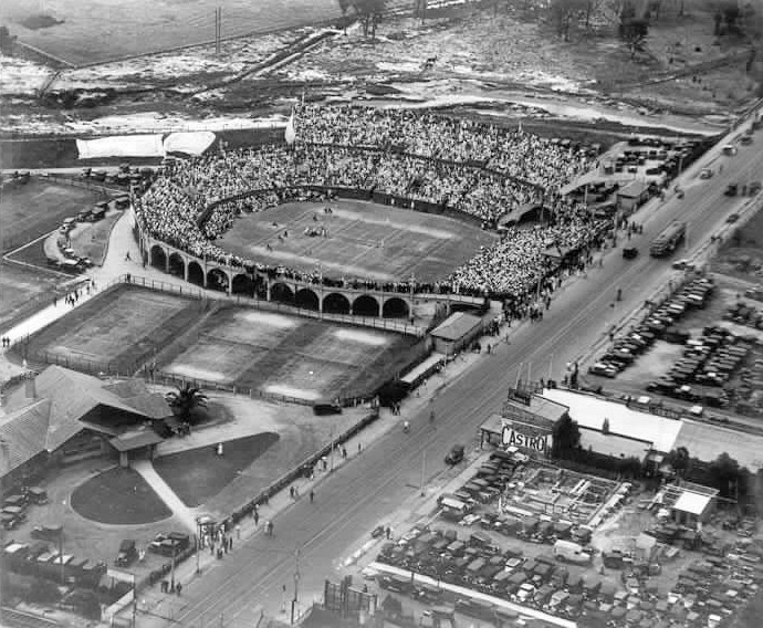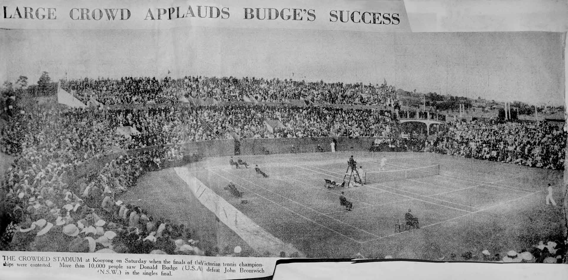 First horseshoe shaped seating level of concrete stadium completed to host Australian Championships won by Gerald Patterson in longest final singles match ever played at Kooyong.