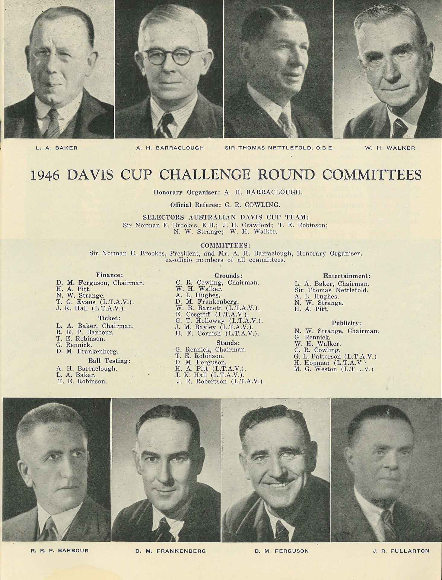 LTAV leases area along north side of Albert Ground to provide facilities for admission of 322 members and to host Davis Cup .Eight grass courts laid down, pavilion built and stands erected. Brookes appointed to LTAV organizing committee. Australia retains Cup defeating USA 3-2.