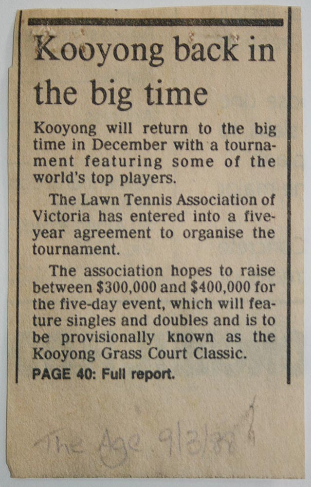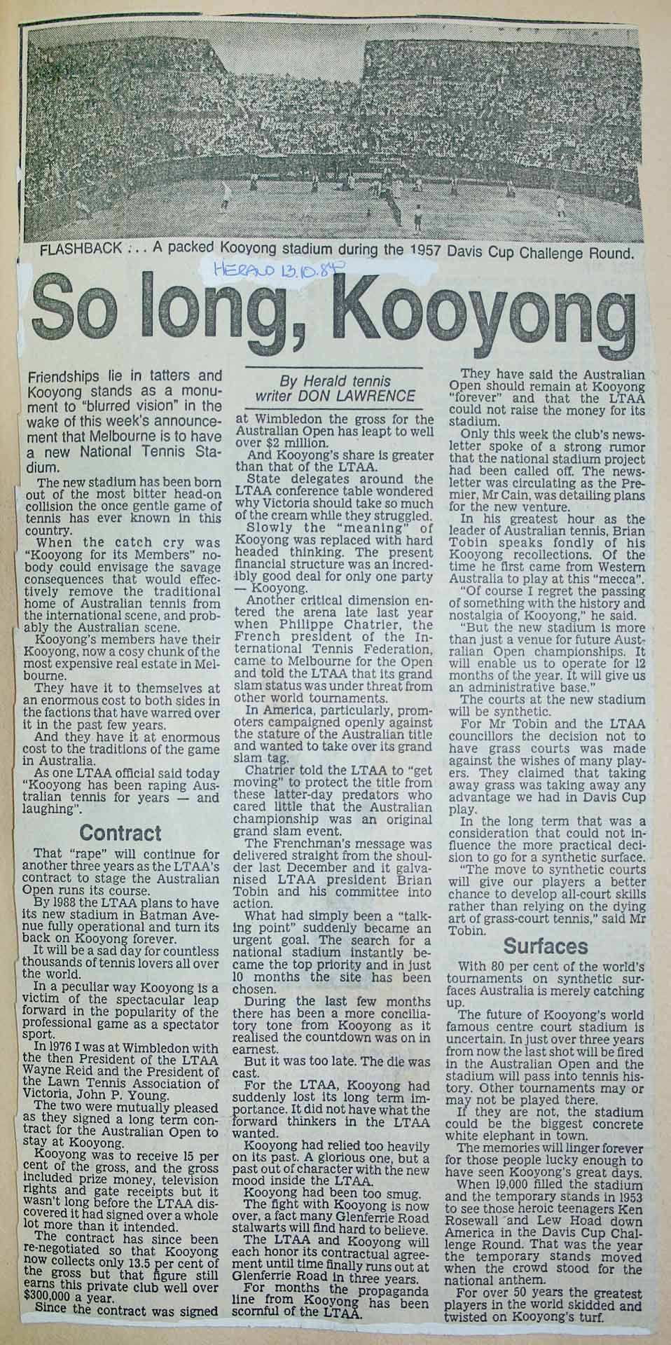 Growing popularity of the game (Brookes and Wilding won back Cup in 1914) leads to decision to purchase 17 acres of freehold land at Kooyong for $6,160.